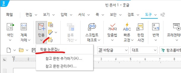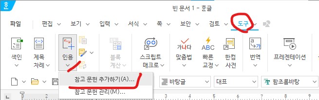 1. '도구' > '인용' > '참고 문헌 추가하기'를 클릭합니다.