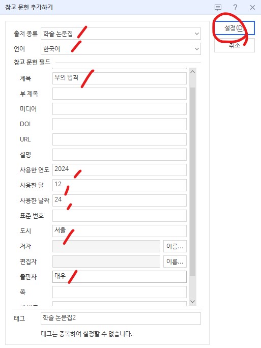 2. 참고문헌 추가하기 대화상자에서 문제에서 제시한 내용을 입력한 다음