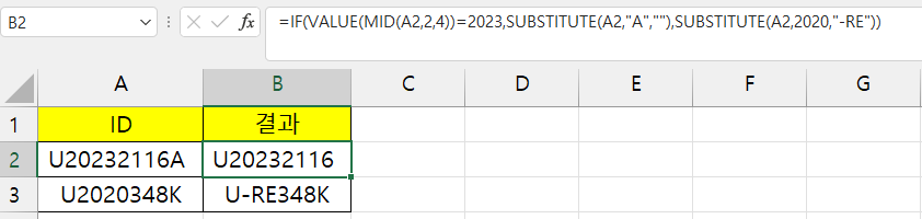 [A2] 셀 ID 2번쨰 글자부터 4글자가 2023이면 A를 공백으로 치환하고, 아니면 2020을 찾아서 -RE로 바꾸시오.