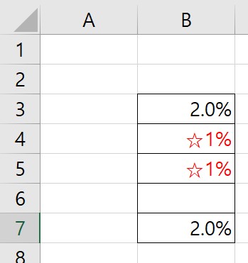 문제) [B3:B7] 영역에 0.02보다 작은 값은 빨강색☆과 2%로 표시, 값이 0인 셀은 빈 칸으로 표시, 나머지는 0.0%로 표시하는 셀 서식을 지정하시오.